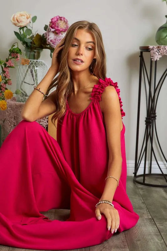 ADORA Full Size Elastic Ruffle Shoulder Jumpsuit Plus Size