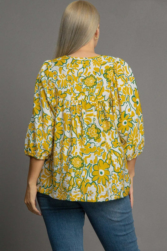 Umgee Plus Size Smocked Floral Print Tie Neck Blouse