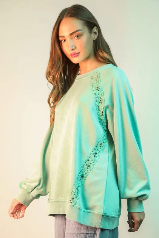 VERY J Plus Size Lace Trim Detail Mineral Washed Knit Top
